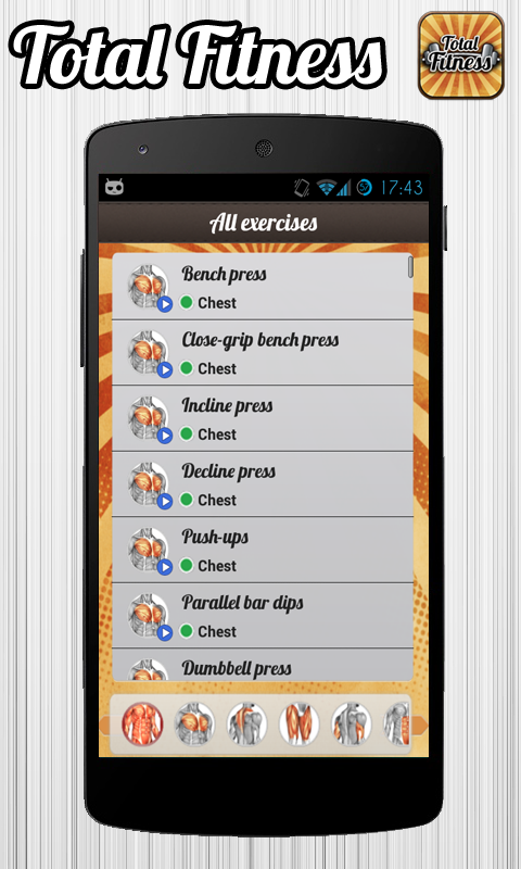 More than 100 different exercises to do at the gym with explanation of the exercise, info about involved muscles, images and an explanation video
